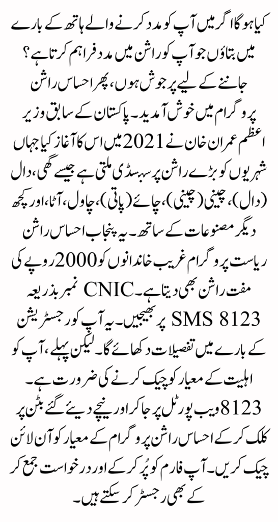 For registration in the Ehsaas Rashan program, you should send sms from 8123. There you can get your registration done 8123 this is the code of the government of Pakistan. To which you send your CNIC number and your verification will done. After that, you told through your CNIC number, how to send a message on it.